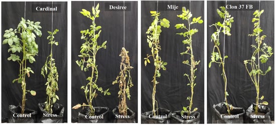 The identification of genetic traits and response mechanisms specific to water stress would improve the adaptation of potato to adverse conditions [13]. Several studies have focused on elucidating the involvement of genes induced by water stress and those most relevant features of tolerance [14,15]. To improve water stress tolerance, potato breeders have been limited by a complex biological system that includes the type of vegetative propagation, autotetraploidy, and high levels of heterozygosity [16]. Furthermore, it has been reported that the response can vary depending on the genotype, severity of the stress, state of plant development, and tissue assessed, so the response mechanism is not yet fully defined [17,18,19]. Nevertheless, different studies have generated much information describing various components to the adaptive response, such as proteins activating the response to stress and signaling factors, proline accumulation, accumulation of osmolytes, osmotic adjustment, ion transport alteration, increase of the efficient use of the water, increase in the oxidative metabolism, adjustment in the hormonal balance, increase in the root growth, inhibition of the foliar growth, water changes of xylem, and the maintenance of turgor [4,8].