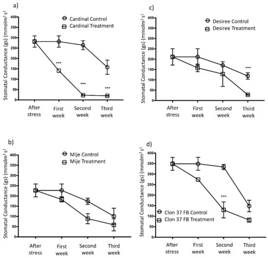 Profile of stomatal conductance (gs) (mmol m−2 s−1) measured once per week for three weeks of water stress in four potato genotypes, (a) Cardinal and (b) Desiree, (c) Mije, and (d) Clone 37 FB genotypes, under greenhouse conditions (23 °C ± 3. 16/8 h day/night photoperiod). (*** shows differences between treatments).