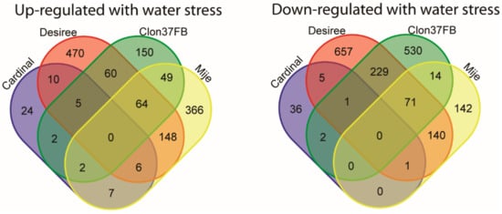 Venn diagram of differentially expressed genes. Up- and downregulated genes with water stress for each of the cultivars were compared.