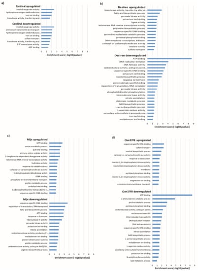 GO term enrichment. topGO was used to analyze the enrichment of GO terms for up- and downregulated genes for (a) Cardinal, (b) Desirée, (c) Mije, and (d) Clone 37 FB.