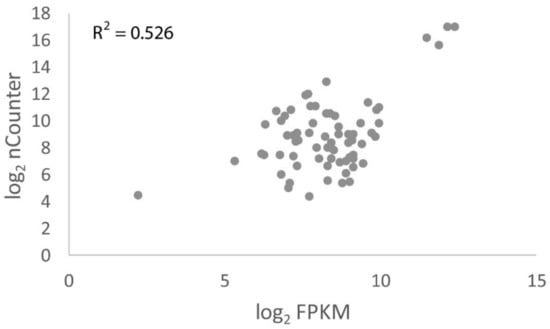 Gene expression analysis for 24 random genes previously found to be expressed in leaves [40] was examined using nCounter and compared to FPKM from the transcriptome sequencing analysis. The analysis demonstrated that there was a positive correlation between the gene expression measured using transcriptome sequencing and nCounter (Figure 7). These results are a validation of the transcriptome sequencing FPKM measures of gene expression.