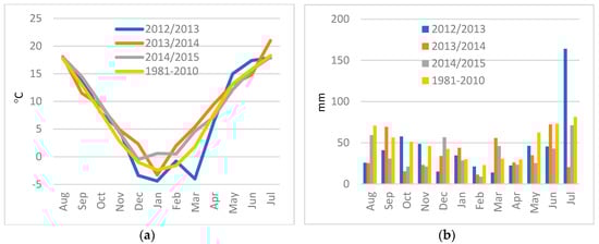 (a) Mean monthly temperature (°C) and (b) total monthly precipitation (mm), during the growing seasons of 2012–2015 vs. the long-term average (1981–2010).