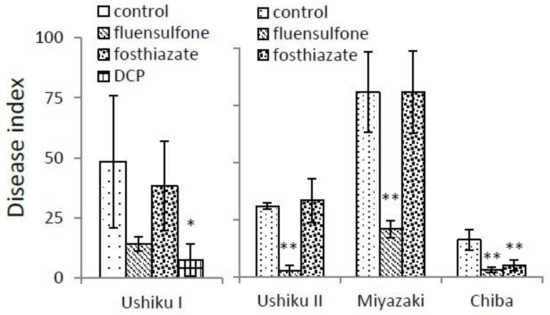 Disease index in Ushiku I, Ushiku II and Miyazaki at 2-months after planting, and Chiba at 4-months after planting. Experimental plots were treated with fluensulfone (4 kg active ingredient (a.i.) ha−1), fosthiazate (3 kg a.i. ha−1), and 1,3-dichloropropene (DCP, 177 kg a.i. ha−1), or non-treated as a control in triplicates. Each value is the mean of three replicates ± standard deviation (** and *: Dunnett’s test, p < 0.01 and p < 0.05, respectively).