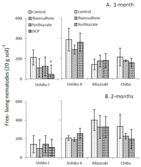 Free-living nematode density (20 g soil)−1 in Ushiku I, Ushiku II, Miyazaki and Chiba at (A): 1- and (B): 2-months after planting. Experimental plots were treated with fluensulfone (4 kg active ingredient (a.i.) ha−1), fosthiazate (3 kg a.i. ha−1), and 1,3-dichloropropene (DCP, 177 kg a.i. ha−1), or non-treated as a control in triplicates. Each value is the mean of three replicates ± standard deviation (*: Dunnett’s test, p < 0.05).