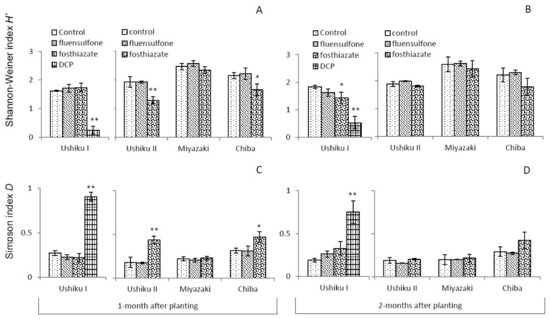 Shannon-Wiener index H’ (A,B) and Simpson index D (C,D) in Ushiku I, Ushiku II, Miyazaki and Chiba at 1- (A,C) and 2-months (B,D) after planting. Experimental plots were treated with fluensulfone (4 kg active ingredient (a.i.) ha−1), fosthiazate (3 kg a.i. ha−1), and 1,3-dichloropropene (DCP, 177 kg a.i. ha−1), or non-treated as a control. Each value is the mean of three replicates ± standard deviation (** and *: Dunnett’s test, p < 0.01 and p < 0.05, respectively).