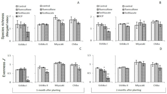 Species richness (Margalef index; (A,B)) and Evenness J’ (C,D) in Ushiku I, Ushiku II, Miyazaki and Chiba at 1- (A,C) and 2-months (B,D) after planting. Experimental plots were treated with fluensulfone (4 kg active ingredient (a.i.) ha−1), fosthiazate (3 kg a.i. ha−1), and 1,3-dichloropropene (DCP, 177 kg a.i. ha−1), or non-treated as a control. Each value is the mean of three replicates ± standard deviation (** and *: Dunnett’s test, p < 0.01 and p < 0.05, respectively).