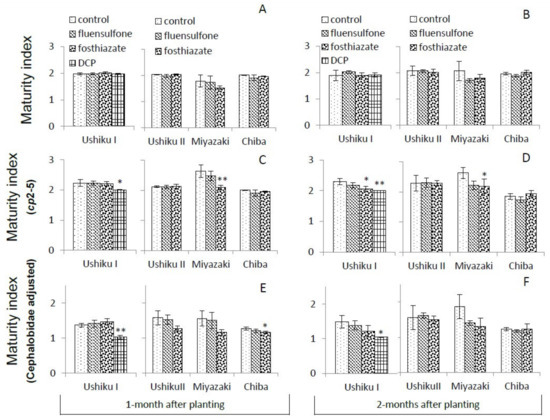 Maturity index (A,B), Maturity index (cp2–5; (C,D)) and Maturity index (Cephalobidae adjusted; (E,F)) in Ushiku I, Ushiku II, Miyazaki and Chiba at 1- (A,C,E) and 2-months (B,D,F) after planting. Experimental plots were treated with fluensulfone (4 kg active ingredient (a.i.) ha−1), fosthiazate (3 kg a.i. ha−1), and 1,3-dichloropropene (DCP, 177 kg a.i. ha−1), or non-treated as a control. Each value is the mean of three replicates ± standard deviation (** and *: Dunnett’s test, p < 0.01 and p < 0.05, respectively).