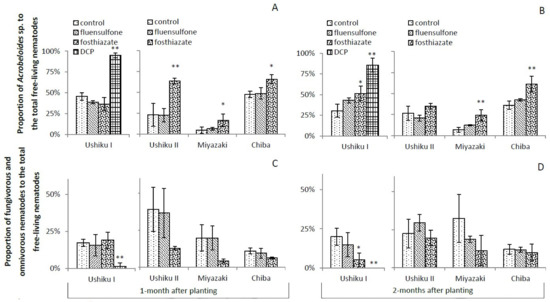 Proportion of Acrobeloides sp. (A,B) and that of fungivorous and omnivorous nematodes (C,D) to the total free-living nematodes in Ushiku I, Ushiku II, Miyazaki and Chiba at 1- (A,C) and 2-months (B,D) after planting. Experimental plots were treated with fluensulfone (4 kg active ingredient (a.i.) ha−1), fosthiazate (3 kg a.i. ha−1), and 1,3-dichloropropene (DCP, 177 kg a.i. ha−1), or non-treated as a control. Each value is the mean of three replicates ± standard deviation (** and *: Dunnett’s test, p < 0.01 and p < 0.05, respectively).