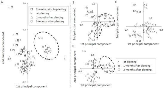 Principal component analysis for (A): Ushiku I, (B): Ushiku II, (C): Miyazaki and (D): Chiba. Experimental plots were treated with fluensulfone (4 kg active ingredient (a.i.) ha−1), fosthiazate (3 kg a.i. ha−1) and 1,3-dichloropropene (DCP, 177 kg a.i. ha−1), or non-treated as a control in triplicates. Numbers in the graphs indicate 1: non-treated control, 2: fluensulfone, 3: fosthiazate and 4: DCP.
