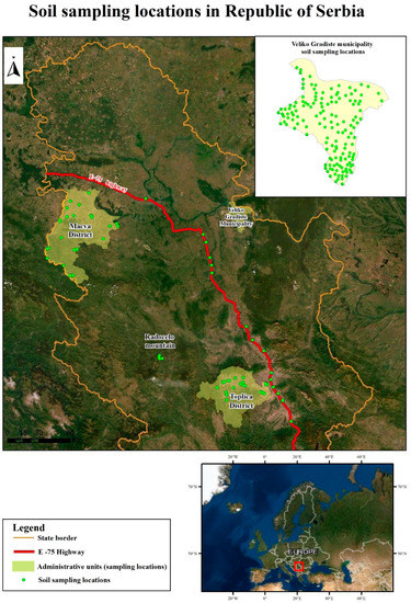Samples of the soil material were taken from 240 sites belonging to agricultural soil on the territory of the Republic of Serbia, and one composite sample was taken in the period 2010–2018. The areas covered by this survey are: Municipality of Veliko Gradište, Mačva and Toplica districts, a section of the E75 highway through Serbia from Belgrade to Preševo, and the area of Radočelo Mountain. Samples were taken in disturbed conditions from each site, and a composite sample, consisting of 20–25 individual samples, was taken using a soil sampling probe from a depth of 0–30 cm. After sampling, samples were prepared for analyses in accordance with SRPS ISO 11464 [30].