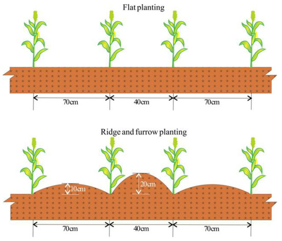 In recent years, many attempts have been made to alleviate water stress to plants and improve rainwater use efficiency [4,5,6]. Alternatively, ridge and furrow planting with full film mulching (RFP) has been regarded as an effective approach to reduce soil evaporation, harvest rainwater, and conserve soil moisture. The adoption of RFP has been shown to increase crop yields, compared with traditional flat planting. However, RFP usually requires an increased use of chemical fertilizers and pesticides to guarantee yield formation [3]. Also, there is clear evidence that RFP depletes more soil moisture and consumes more nutrients in deep layers than do other planting patterns (e.g., flat planting; furrow planting between ridges) [7]. To meet the higher demand of nutritional uptake by plants with RFP, local farmers generally apply a high dose of compound fertilizers during spring maize life cycle. Consequently, RFP not only accelerates soil desiccation, but also brings about environmental pollution such as high risk of nitrogen leaching and soil degradation [8].