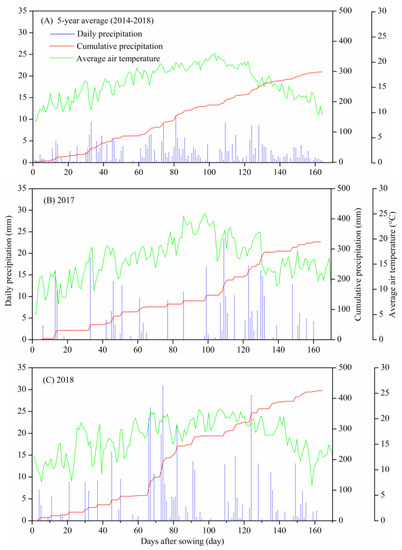 Daily and cumulative precipitation (mm), and daily average air temperature (°C) from April to September at Dingxi Experimental Station. (A) Five-year average values during 2014–2018; (B) data in 2017 and (C) data in 2018.
