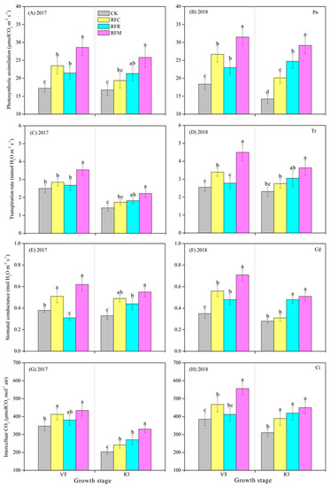 Relevant photosynthetic parameters, including photosynthetic assimilation rate (Pn, µmol CO2 m−2 s−1), transpiration rate (Tr, mmol H2O m−2 s−1), stomatal conductance (Cd, mol H2O m−2 s−1), and intercellular CO2 concentration (Ci, µmol CO2 mol−1 air), were measured from 09:00 to 11:00 at the VT and R3 stages on the ear leaves of three uniform plants from three selected sampling areas in each plot using a Li-6400XT Portable Photosynthesis System (Li-Cor Inc., Lincoln, NE, USA). The chamber was adjusted to 25 °C (temperature), 360 µM/mol (CO2), and 800 µM m−2 s−1 (photosynthetic photon-flux density).