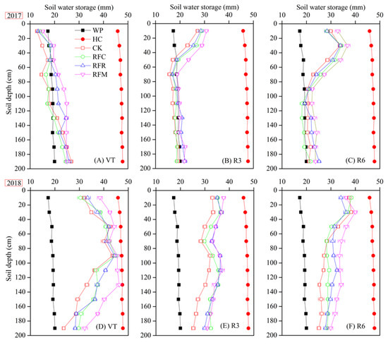 Dynamics of soil water storage in 0–200 cm soil depth at VT (A,D), R3 (B,E), and R6 (C,F) stages of spring maize at Dingxi Experimental Station in 2017 and 2018. Solid dark squares stand for soil water storage at wilting point, and solid red cycles represent soil water storage at field holding capacity. Bars are standard errors at p < 0.05.