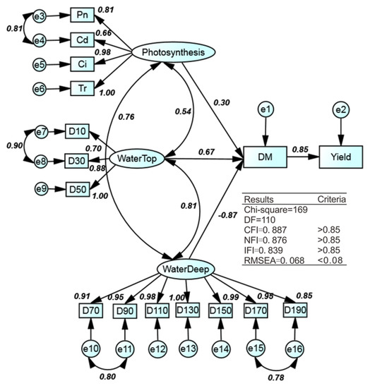 Structural equation model (SEM) is a multivariate statistic procedure to estimate the correlation coefficients of each path in a system of variables. SEM is always used to investigate the complex networks of relationships among variables. All data of SWS, DM, grain yields, and photosynthetic parameters were measured variables in SEM analysis. Latent variable of photosynthesis was reflected by the measured variables of Pn, Cd, Ci, and Tr. Latent variables of WaterTop and WaterDeep were reflected by the SWS data in the depth of 0–60 cm and 60–200 cm, respectively.