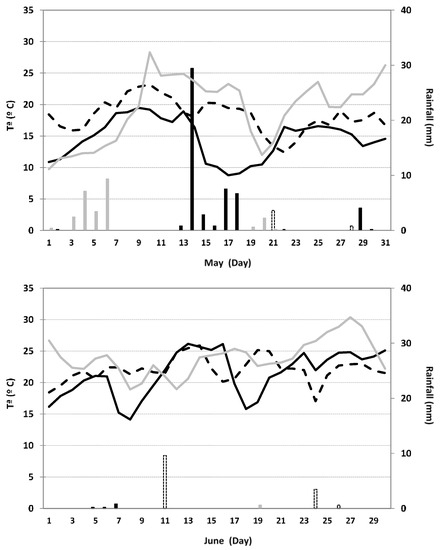 Daily meteorological conditions at the experimental site in Seseña, Toledo, Spain. Lines represent the mean temperatures (°C), and bars represent the rainfall (mm) during the months of May and June in 2012 (grey), 2013 (black, continuous) and 2014 (black, discontinuous).
