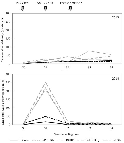 Figure 3 displays the effects of the five weed management programs on the mean total weed density when assessed at the S0, S1, S2, S3 and S4 sampling times in 2013 and 2014. In 2013, the highest weed densities were recorded at 50 DAS (S2 sampling time) in the HR + Gly program and at 70 DAS (S3 sampling time) in the HR program. In 2014, the highest weed densities were recorded at 30 DAS in all weed management programs. Weed density at the five sampling times in those management programs that did not include an application of a pre-emergent herbicide was greater than those in the other management programs.