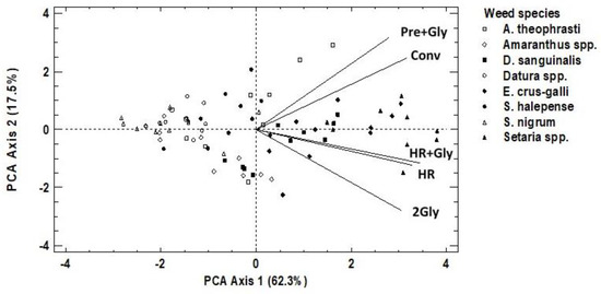 The relationship between weed species abundance and the weed management programs was examined by PCA (Figure 4). The results of this analysis revealed a positive correlation between monocotyledonous weed species, such as Setaria spp., E. crus-galli or D. sanguinalis, and the HR, HR + Gly and 2 Gly management programs. The analysis also showed a positive correlation for the abundance of A. theophrasti in the Pre + Gly and Conv programs. No significant relationships between the abundance of other species, such as S. halepense, S. nigrum or Datura spp. and the weed management programs were detected (Figure 4 and Table 4).