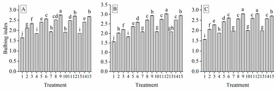 Bulbing index of cvs. G103 (A), G024 (B), and G2011-5 (C). Numbers (1–15) indicate 1: L8T20, 2: L8T25, 3: L8T30, 4: L10T20, 5: L10T25, 6: L10T30, 7: L12T20, 8: L12T25, 9: L12T30, 10: L14T20, 11: L14T25, 12: L14T30, 13: L16T20, 14: L16T25, 15: L16T30; Different letters indicate significant differences at p < 0.05 (ANOVA and Tukey HSD test); means ± SD.