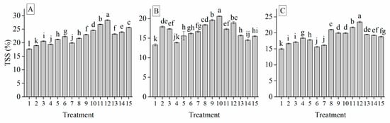 Total soluble solid (TSS) (%) of cvs. G103 (A), G024 (B), and G2011-5 (C). Numbers (1–15) indicate 1: L8T20, 2: L8T25, 3: L8T30, 4: L10T20, 5: L10T25, 6: L10T30, 7: L12T20, 8: L12T25, 9: L12T30, 10: L14T20, 11: L14T25, 12: L14T30, 13: L16T20, 14: L16T25, 15: L16T30; Different letters indicate significant differences at p < 0.05 (ANOVA and Tukey HSD test); means ± SD.