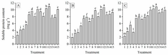 Soluble protein content (mg g−1) of cvs. G103 (A), G024 (B), and G2011-5 (C). Numbers (1–15) indicate 1: L8T20, 2: L8T25, 3: L8T30, 4: L10T20, 5: L10T25, 6: L10T30, 7: L12T20, 8: L12T25, 9: L12T30, 10: L14T20, 11: L14T25, 12: L14T30, 13: L16T20, 14: L16T25, 15: L16T30 Different letters indicate significant differences at p < 0.05 (ANOVA and Tukey HSD test); means ± SD.