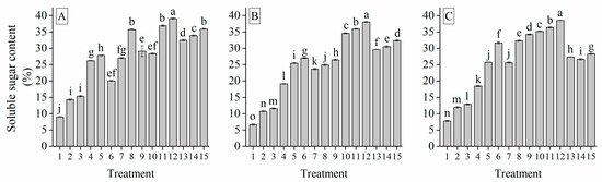 Soluble sugar content (%) of cvs. G103 (A), G024 (B), and G2011–5 (C). Numbers (1–15) indicate 1: L8T20, 2: L8T25, 3: L8T30, 4: L10T20, 5: L10T25, 6: L10T30, 7: L12T20, 8: L12T25, 9: L12T30, 10: L14T20, 11: L14T25, 12: L14T30, 13: L16T20, 14: L16T25, 15: L16T30 Different letters indicate significant differences at p < 0.05 (ANOVA and Tukey HSD test); means ± SD.