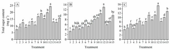 Total sugar content (mg g−1) of cvs. G103 (A), G024 (B), and G2011-5 (C). Numbers (1–15) indicate 1: L8T20, 2: L8T25, 3: L8T30, 4: L10T20, 5: L10T25, 6: L10T30, 7: L12T20, 8: L12T25, 9: L12T30, 10: L14T20, 11: L14T25, 12: L14T30, 13: L16T20, 14: L16T25, 15: L16T30 Different letters indicate significant differences at p < 0.05 (ANOVA and Tukey HSD test); means ± SD.
