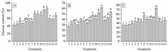 Glucose content (%) of cvs. G103 (A), G024 (B) and G2011–5 (C). Numbers (1–15) indicate 1: L8T20, 2: L8T25, 3: L8T30, 4: L10T20, 5: L10T25, 6: L10T30, 7: L12T20, 8: L12T25, 9: L12T30, 10: L14T20, 11: L14T25, 12: L14T30, 13: L16T20, 14: L16T25, 15: L16T30 Different letters indicate significant differences at p < 0.05 (ANOVA and Tukey HSD test); means ± SD.