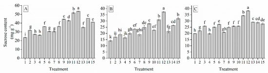 Sucrose content (mg g−1) of cvs. G103 (A), G024 (B), and G2011-5 (C). Numbers (1–15) indicate 1: L8T20, 2: L8T25, 3: L8T30, 4: L10T20, 5: L10T25, 6: L10T30, 7: L12T20, 8: L12T25, 9: L12T30, 10: L14T20, 11: L14T25, 12: L14T30, 13: L16T20, 14: L16T25, 15: L16T30 Different letters indicate significant differences at p < 0.05 (ANOVA and Tukey HSD test); means ± SD.