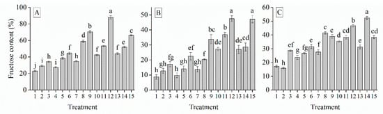 Fructose content (%) of cvs. G103 (A), G024 (B), and G2011-5 (C). Numbers (1–15) indicate 1: L8T20, 2: L8T25, 3: L8T30, 4: L10T20, 5: L10T25, 6: L10T30, 7: L12T20, 8: L12T25, 9: L12T30, 10: L14T20, 11: L14T25, 12: L14T30, 13: L16T20, 14: L16T25, 15: L16T30 Different letters indicate significant differences at p < 0.05 (ANOVA and Tukey HSD test); means ± SD.