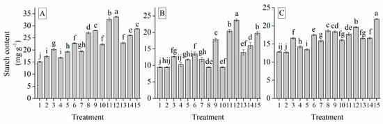 Starch content (mg g−1) of cvs. G103 (A), G024 (B), and G2011-5 (C). Numbers (1–15) indicate 1: L8T20, 2: L8T25, 3: L8T30, 4: L10T20, 5: L10T25, 6: L10T30, 7: L12T20, 8: L12T25, 9: L12T30, 10: L14T20, 11: L14T25, 12: L14T30, 13: L16T20, 14: L16T25, 15: L16T30 Different letters indicate significant differences at p < 0.05 (ANOVA and Tukey HSD test); means ± SD.