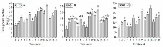 Total phenol content (mg g−1) of cvs. G103 (A), G024 (B), and G2011-5 (C). Numbers (1–15) indicate 1: L8T20, 2: L8T25, 3: L8T30, 4: L10T20, 5: L10T25, 6: L10T30, 7: L12T20, 8: L12T25, 9: L12T30, 10: L14T20, 11: L14T25, 12: L14T30, 13: L16T20, 14: L16T25, 15: L16T30 Different letters indicate significant differences at p < 0.05 (ANOVA and Tukey HSD test); means ± SD.