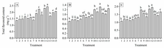 Total flavonoid content (mg g−1) of cvs. G103 (A), G024 (B), and G2011-5 (C). Numbers (1–15) indicate 1: L8T20, 2: L8T25, 3: L8T30, 4: L10T20, 5: L10T25, 6: L10T30, 7: L12T20, 8: L12T25, 9: L12T30, 10: L14T20, 11: L14T25, 12: L14T30, 13: L16T20, 14: L16T25, 15: L16T30 Different letters indicate significant differences at p < 0.05 (ANOVA and Tukey HSD test); means ± SD.