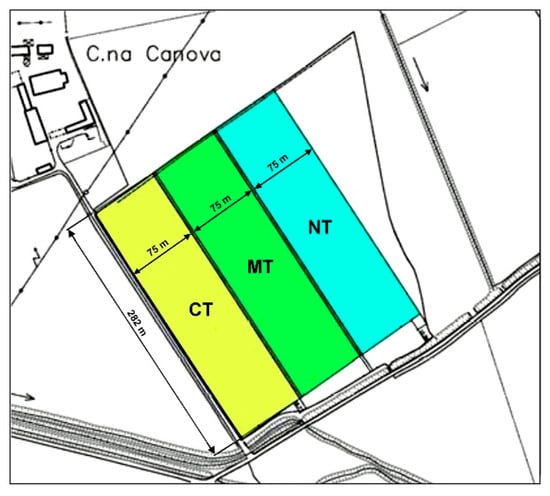The three plots, named CT (conventional tillage), MT (minimum tillage), and NT (no-tillage), respectively, underwent different soil preparation to seeding. The other crop operations—fertilization (3 distributions), pre-emergence (1 application) and post-emergence (1 application) herbicide treatments, fungicide treatments (2 applications), and harvesting—were exactly the same (same dates, same amount, and dose).