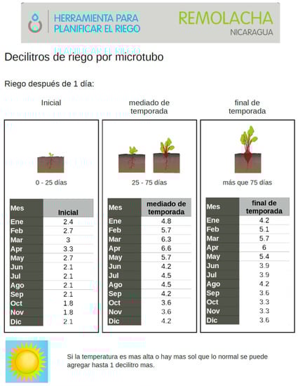 Water Chart used during trial with beetroot in Sébaco: The chart indicates for the three main crop stages with how many deciliters (dL) per emitter the farmer should irrigate in each month (calculated according to average climatic data for the region). For sunny, hot periods it was suggested to increase irrigation water amounts by 1 dL per emitter (i.e., approximately 1.67 mm; bottom of the chart). The first page gives irrigation recommendations for daily irrigation, a second page (not shown) indicates the application depth for irrigation every second and third day. [An English translation of the chart is given in Appendix A.]
