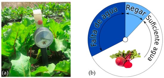 (a) Custom-made tensiometer used for the Water Chart trial with beetroot in Sébaco. (b) Manometer display used for the trial; the levels indicate “enough water” (<350 mbar; “Sufficiente agua”), “irrigate” (350–500 mbar; “Regar”), and “water lacking” (>500 mbar; “Falta de agua”).