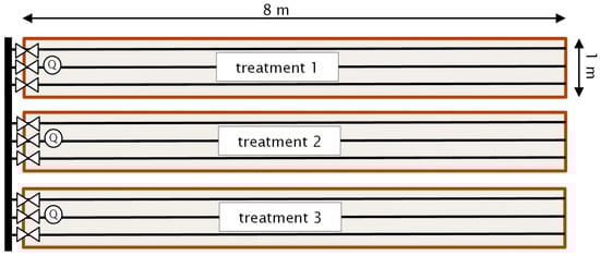 Sketch of a trial repetition at one farmer: Each of the three banks of 8 × 1 m was irrigated by three laterals. Each lateral could be managed individually by a valve. On the middle lateral of each bank, irrigation water use was measured using a water meter (Q).