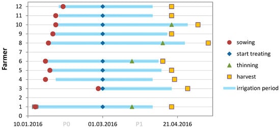 Overview of important dates of the Water Chart trial in Sébaco: farmers seeded on different dates but all started treating (applying different irrigation scheduling regimes according to tensiometer readings and the Water Chart) on the same date. P0 is the period when all treatments were managed equally and P1 is the period when farmers applied different irrigation scheduling regimes. Some farmers harvested the biggest beetroots early to give the remaining plants more space (“thinning”). Farmers 2 and 7 had 100% crop loss due to chickens and poor management, respectively (n = 10).