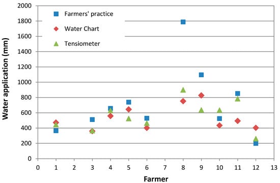 On average, farmers irrigated 1222, 993 and 977 mm in the control (farmers’ practice), Water Chart and tensiometer treatments, respectively, of which 726, 534, and 564 mm, respectively, were during P1. This is equivalent to a 19% and 20% reduction in water use in the Water Chart and tensiometer treatments compared with the control treatment over the entire growing cycle, and 26% and 22% during the period when the irrigation scheduling tools were applied (P1). There was no rain during the trial period, and one farmer (farmer 12) ran out of water. With few exceptions (mainly farmers 8, 9, and 11), irrigation water applications were similar for all treatments on individual farms (ICC = 0.56), but differed considerably among farms (Figure 7).