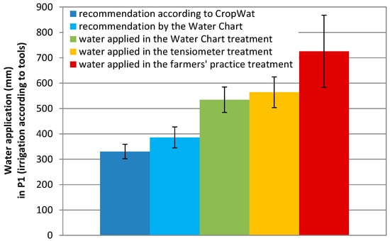Application of irrigation water in the Water Chart, tensiometer and farmers’ practice treatments during trial period P1 (irrigation regime according to the tools) as compared to the recommendation by the Water Chart and calculations of irrigation requirement by CropWat (assuming 70% irrigation efficiency). Error bars indicate standard errors of the means (n = 10).