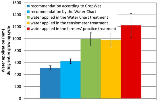 Application of irrigation water in the Water Chart, tensiometer and farmer practice treatments during the entire growing cycle as compared to the respective recommendation by the Water Chart and calculations of irrigation requirement by CropWat (assuming 70% irrigation efficiency). Error bars indicate standard errors of the means (n = 10).