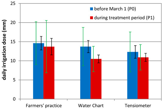 Farmers used almost 40% more water than recommended for the Water Chart treatment; this means that farmers did not fully follow the recommendations. In the final evaluation of the trial the farmers mentioned, for example: “When irrigating the tensiometer plot, I also gave a little bit to the ‘Water Chart’ plot”. Nevertheless, farmers applied significantly less water per day (average daily water application in mm) during P1 than during P0, particularly when using the irrigation scheduling tools (Figure 10). This means that the farmers did consider the recommendations at least to a certain extent.