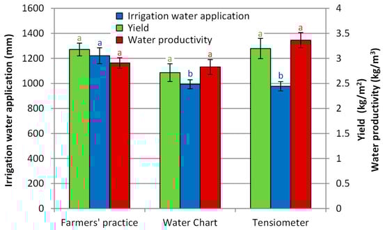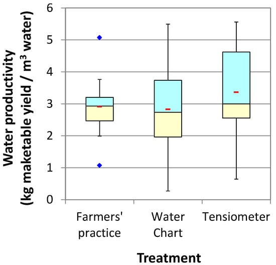 Although water use was significantly reduced when irrigation scheduling was facilitated by the Water Chart and tensiometers, water productivity was not significantly improved. Water productivity in the tensiometer treatment was slightly higher than in the other treatments, but the difference was not significant, possibly due to the small sample size and large variation. Figure 13 shows average crop yield, water application and water productivity in the three treatments. Comparing the Water Chart and tensiometer treatments demonstrates the important effect yield has on water productivity when water use is similar. By increasing yields, water productivity can be substantially enhanced, which has also been shown by Pienaar [31].