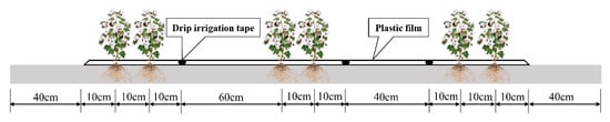 Figure 1). Each plot was 6 m long and 4.4 m wide, with a planting density of 480 plants per plot. Single-wing labyrinth drip irrigation tape was used for irrigation. The diameter of drip irrigation tape was 16 mm, the distance between drip emitters was 0.3 m, and average flow rate of drip emitters was 3.2 L/h. Water meters, ball valves, and fertilizer cans were installed at the beginning of each experimental plot to quantitatively control irrigation and fertilization. Cotton was sown on 22 April 2017 and 25 April 2018, respectively. At the same time, according to the corresponding level of nitrogen application, 30% of nitrogen (10%
