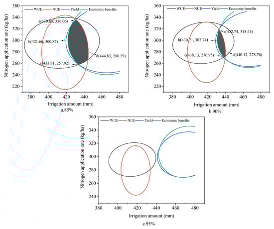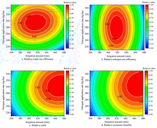 Although there are many studies on the water–nitrogen coupling effect in drip irrigation crops, most results show that the best combination of water and nitrogen for the study area comes from the established water and nitrogen treatment. However, due to limited numbers of experimental treatments, the suitable combination of water and nitrogen input is often outside the established treatments, and any single treatment cannot take into account the multiple objectives of improving quality, yield, and WUE and NUE. Hou et al. conducted a quadratic regression analysis of irrigation and fertilizer application; spatial analysis showed that for irrigation of 725–825 mm and nitrogen application of 273.6–355.6 kg/ha, grape yield, quality, and economic benefits could be simultaneously achieved [