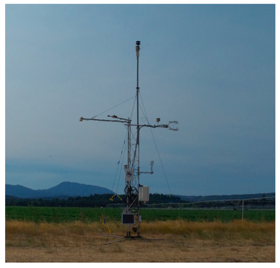 Data were collected for eight months (March–October 2017) with a variety of sensor configurations. All data used in this analysis were collected for the entire eight-month period. For eddy-covariance measurements, an IRGASON integrated sonic anemometer and open path gas analyzer (Campbell Scientific Inc., Logan, UT, USA) was mounted at 2 m above ground level (a.g.l.) and oriented into the dominant daytime wind direction. For some 2–3 week training periods, a NR01 net radiometer (Hukseflux, Delft, The Netherlands), HFP-01 soil heat flux plate (Hukseflux, Delft, The Netherlands) and two HCS2 humidity/temperature probes (Rotronic AG, Bassersdorf, Switzerland) were co-located with the Q-7 net radiometer soil probes and HMP-60 thermohydrometers, respectively. The “low-cost” sensor ensemble included: two humidity and temperature sensors at two measurement heights; soil moisture content temperature potential sensors; tipping bucket rain gauges; sonic anemometers; a Q-7 thermopile net radiometer and a PAR quantum sensor; a cup and vane anemometer. Specific sensors at the two sites are described in Table 1. A typical sensor array used in the field experiments is shown in Figure 1.