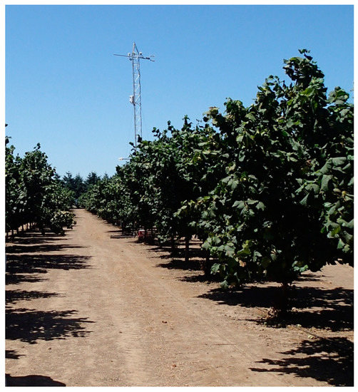 Photograph of experimental site 2 (Hazelnut orchard) showing the eddy-covariance system, net radiometer and other sensors on a 10-m tower in background.