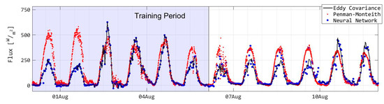 Excerpted time series of latent heat flux determined by the eddy-covariance measurements, Penman-Monteith equation (with no crop coefficient applied) and the actual latent heat flux estimated by the artificial neural network (ANN) method. The shaded area indicates the period used for training the ANN.