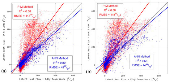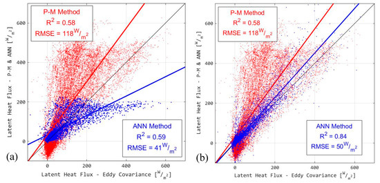 Results at site 1 from (a) 3-day training and (b) 14 day training period. The RMSE indicates the departure of the dependent values (P-M and ANN) from the eddy covariance control.