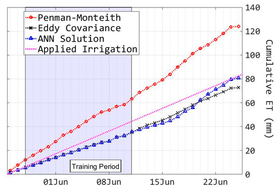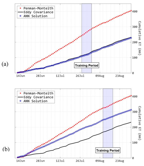 While an optimal training time was relatively easy to determine from multiple iterations, a more challenging consideration is that the resulting model accuracy was primarily influenced by the environmental conditions which occurred during the training period. The ANN estimates for any 7-day training period may be numerically robust but when compared to the entire time series, the ANN was only able to accurately predict flux under conditions which were similar to those observed during training periods. For example, if the ANN is trained during a period of adequate (or over) irrigation, then the resulting ETann estimates will resemble full potential ET, regardless of actual conditions. Likewise, if the training data is only sampled from periods during which the crop exhibits drought stress, the resulting ET estimate will be accordingly too low (Figure 5 and Figure 6).